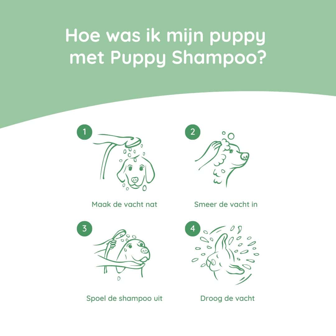 Maak de vacht goed nat met handwarm water. Breng de shampoo met de handen aan en masseer in vanaf de hals tot er een rijk schuim ontstaat. Spoel grondig uit met schoon, handwarm water. Droog de vacht met een handdoek of haardroger en borstel goed door.