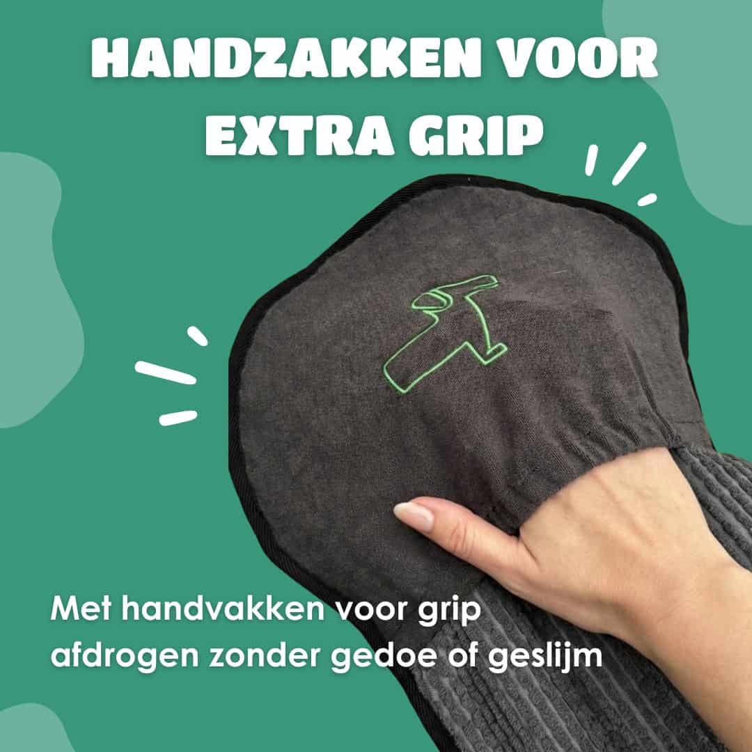 • Handige uitvoering met zakken/insteekopeningen voor je handen voor betere grip bij afdrogen.