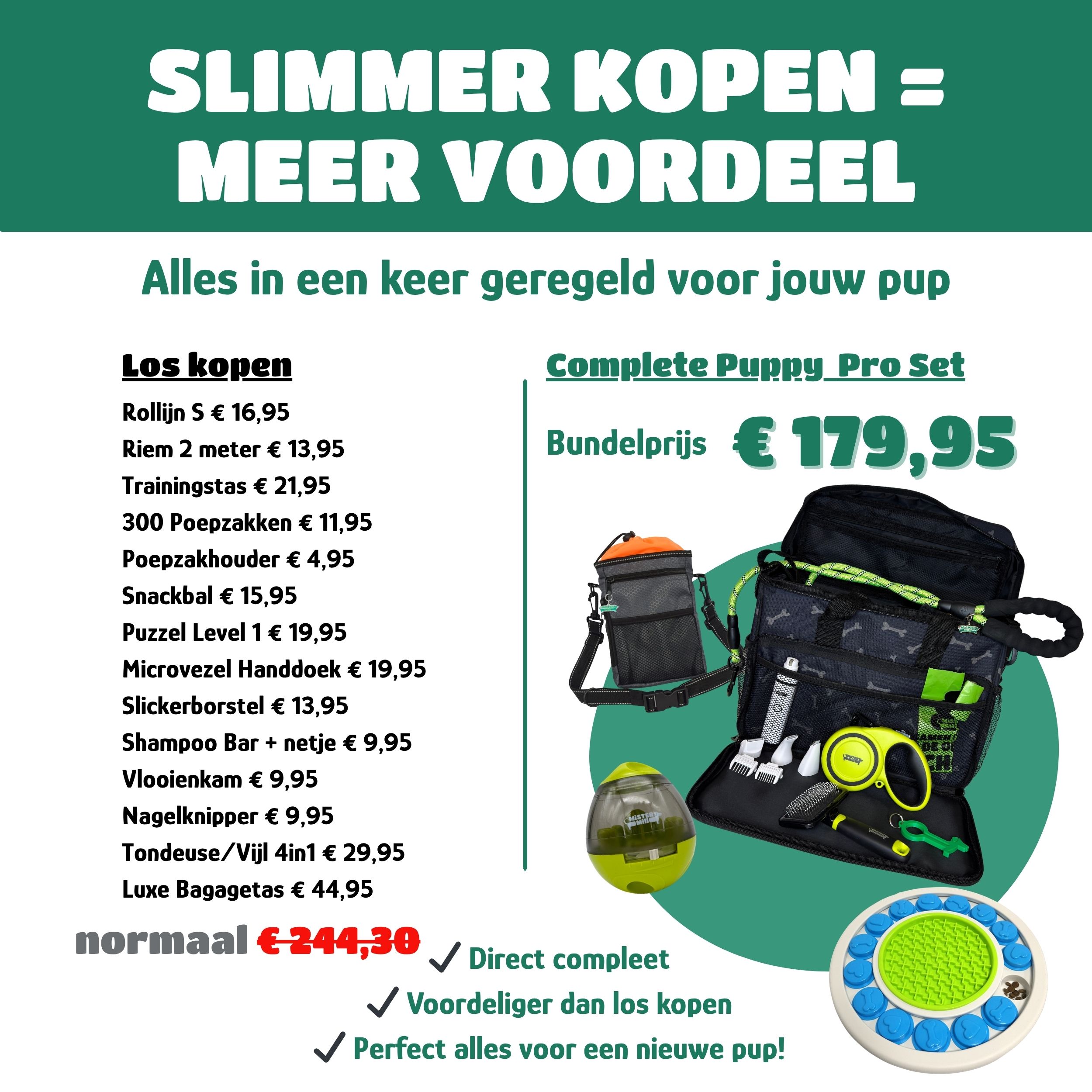 Alles wat je pup nodig heeft, in één complete set.strongp><p>Van vachtverzorging tot training en van spelen tot wandelen: deze 14-delige set is speciaal samengesteld voor pups en jonge honden. Zo begin je vanaf dag één goed — voor jou én je hond.