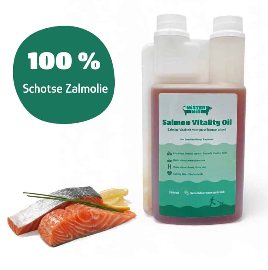 Mister Mill Salmon Vitality Oil voor behoud van een gezonde huid, geeft een prachtige glanzende vacht, zorgt voor soepele gewrichten en ondersteunt het immuunsysteem.