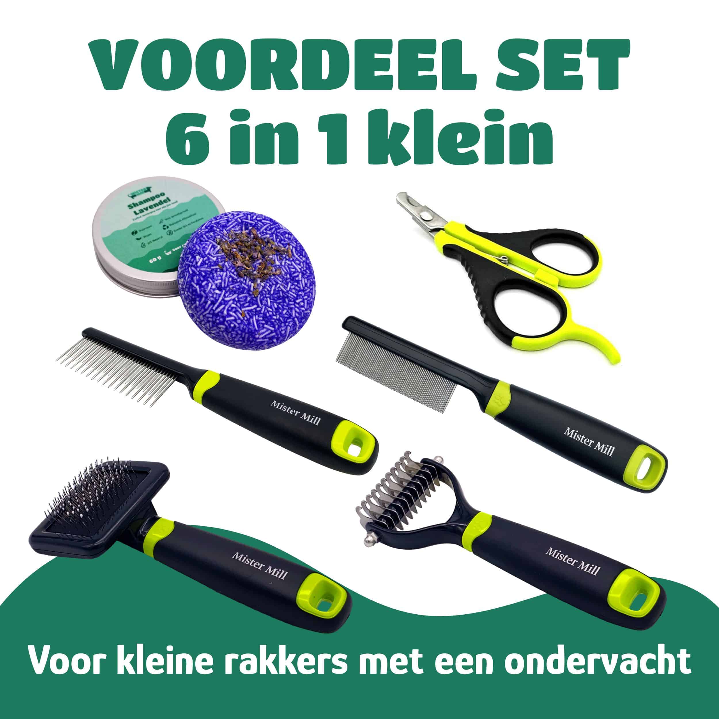 Voordeel Set Compleet 6 in 1 Klein: Eén borstel, drie kammen, nagelknipper klein & shampoo met netje